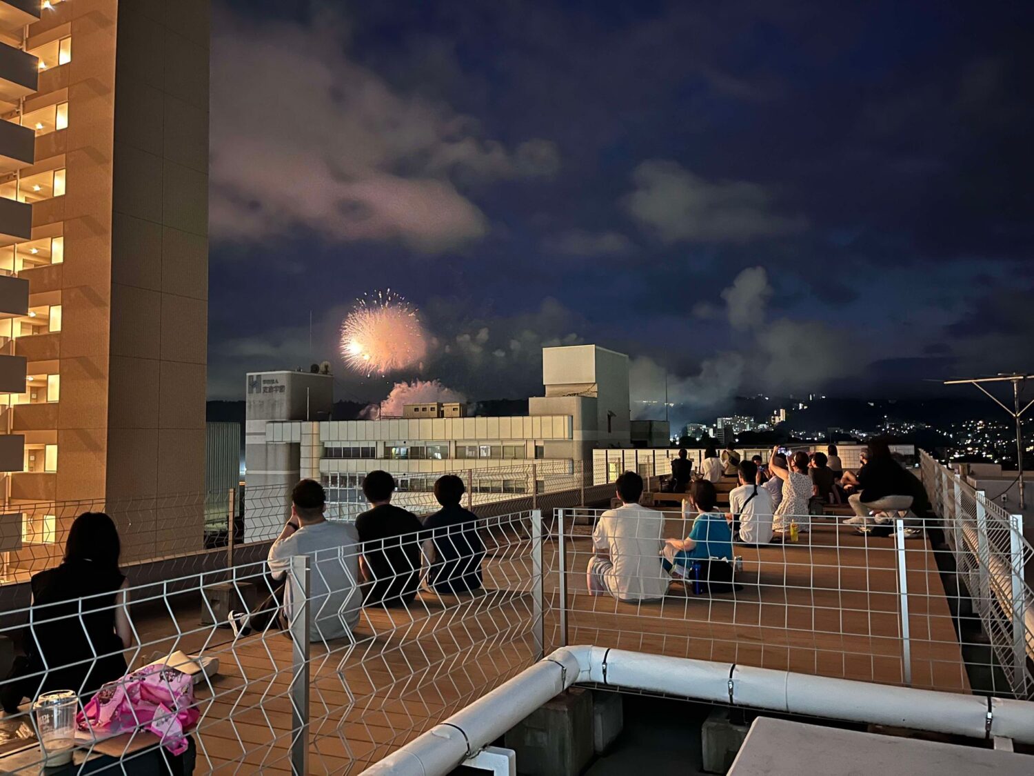 THE6の屋上で入居者さんと『仙台七夕花火祭』を楽しんでいる様子