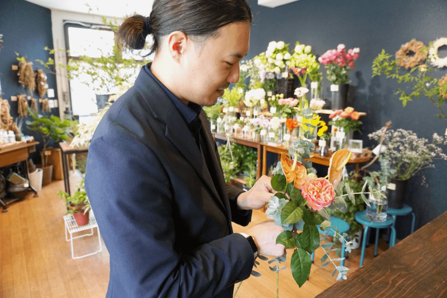 菅原:紺色は『誠実』を意味する色なんです。誠実さについては、前職のブライダルの時から自分の中でポリシーとして大切にしています。お花を長く楽しんでもらえるように育て方のアドバイスを添えたり、お花を仕入れる際の目利きなどを含めて、お客様のためになる行動を普段から心がけていますね。