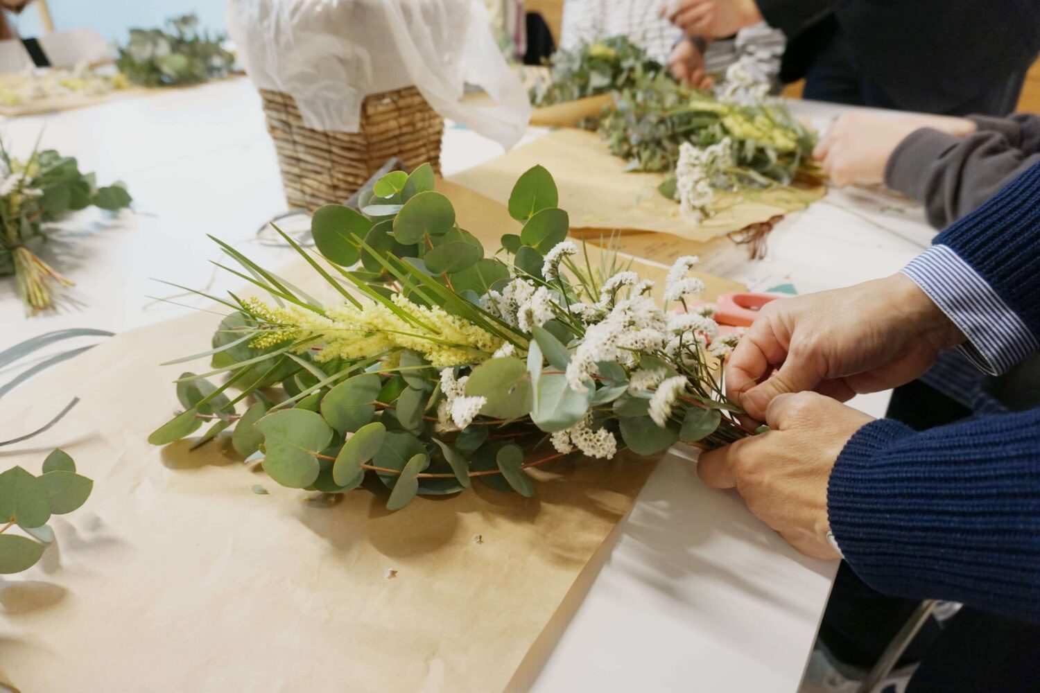 ワークショップには、香り高いユーカリをメインとした花材が用意されました。参加者さんは菅原さんにアドバイスを求めながら、花材の配置にそれぞれのこだわりを込めて束ねていらっしゃいました。