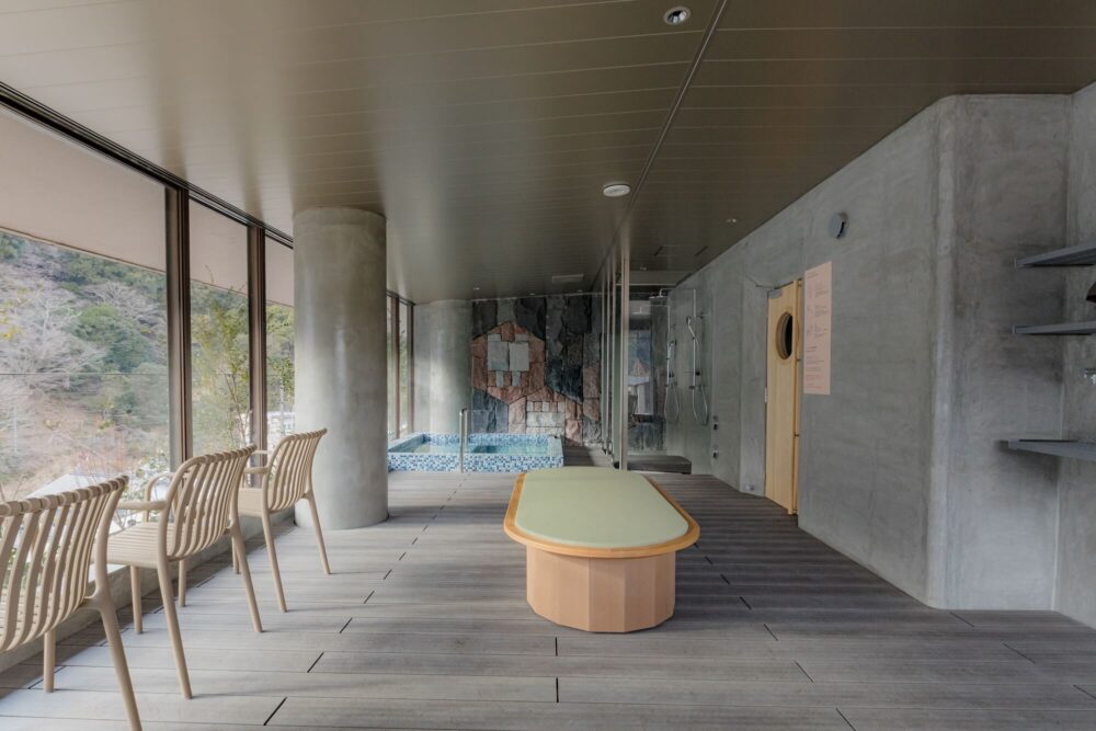 また、「恩湯」をぜひ体験して欲しいという想いから、館内にはあえて温泉を用意せず、代わりに宿泊者や地元の人々が楽しめるサウナを設けるなど、地域との連携を大切にしました。恩湯が源泉を男女で共有するように、サウナ室内は熱源を男女で共有しています。