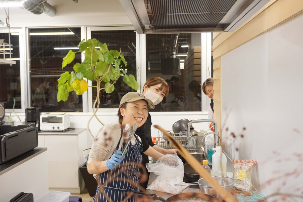 ワークラウンジの中心にあるシェアキッチンで、交流会に向けたお料理の準備が進められていました。
